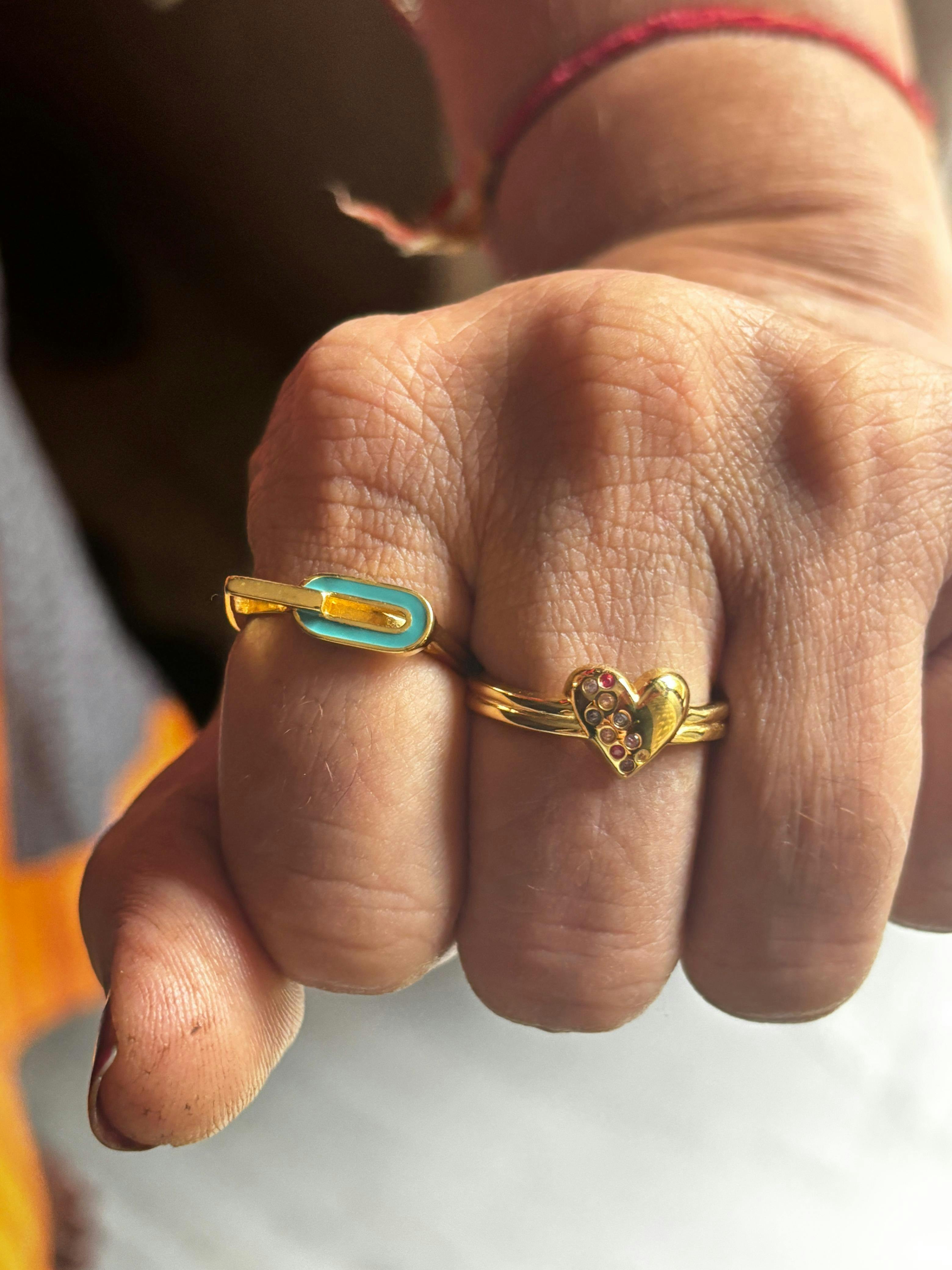 Make a bold statement with the Mankai Geometric Ring, crafted in 925 sterling silver with 14kt gold plating and teal enamel accents. Perfect for brunches, daytime events, or gifting, this ring adds a modern pop of colour to any look.
