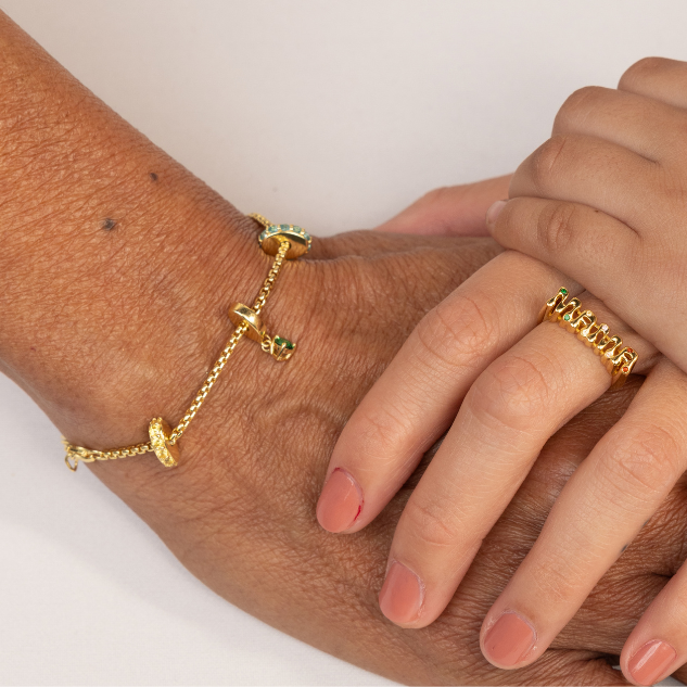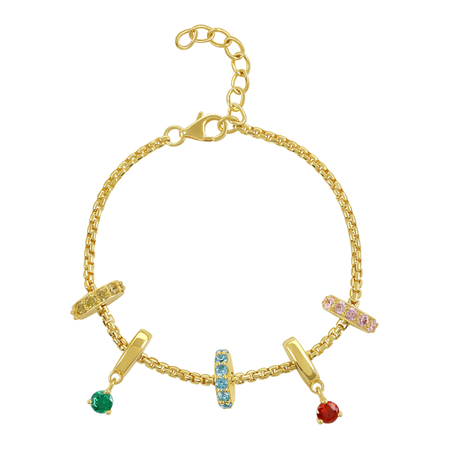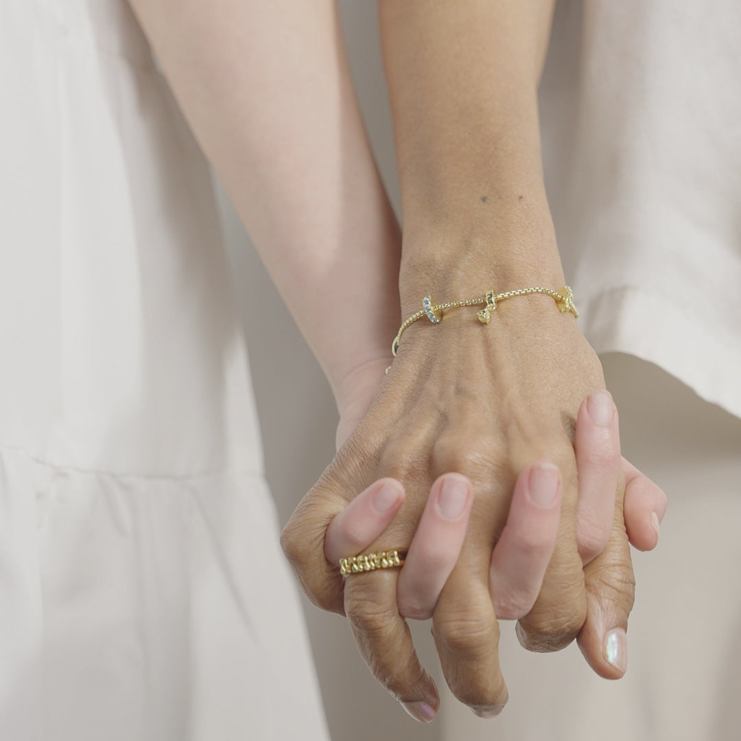 The Mother-Daughter Bracelet celebrates the unbreakable bond between two hearts. Crafted in 925 sterling silver with gold plating and an anti-tarnish finish, this bracelet features slider-style movable elements studded with CZ stones — symbolizing shared memories and individuality. Its adjustable fit ensures all-day comfort and versatility.