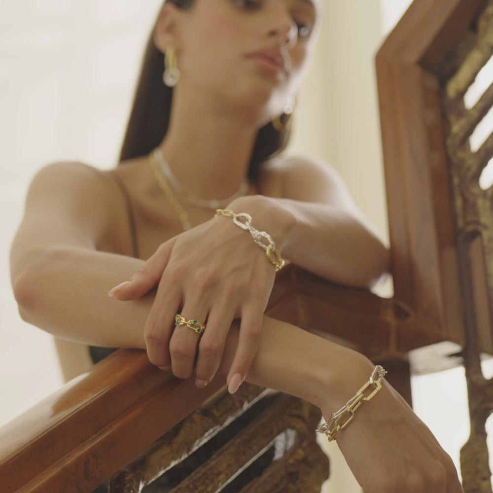 The Yugen Bracelet embodies bold minimalism with a luxurious dual-tone twist. Crafted in 925 sterling silver with 14kt gold and rhodium plating, this bracelet showcases a seamless balance of elegance and edge. Its two-tone finish makes it the perfect statement accessory for both everyday wear and special occasions.