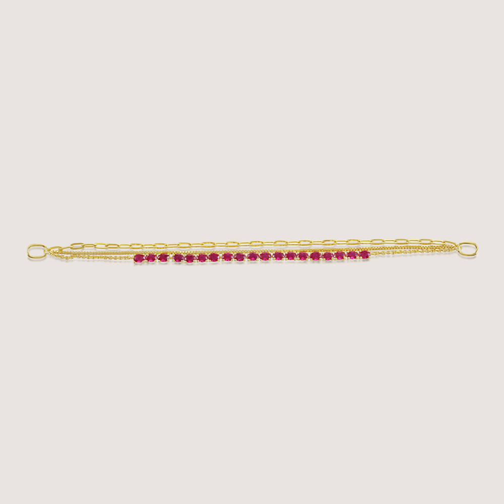 Shop the KiraKira Layered Chain, crafted in 92.5% sterling silver with 14kt gold plating. This elegant anti-tarnish chain features three layered chains, one adorned with ruby CZ stones, making it perfect for customising into bracelets or necklaces. Stylish, versatile, and contemporary, it’s ideal for layering or wearing solo.
