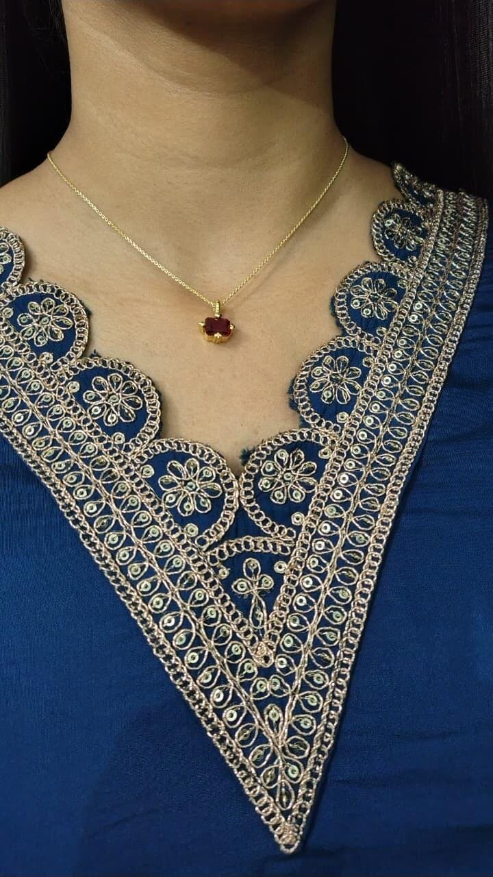 • Style Tip: Pair with minimal outfits or other delicate chains to let the ruby suits pendant stand out