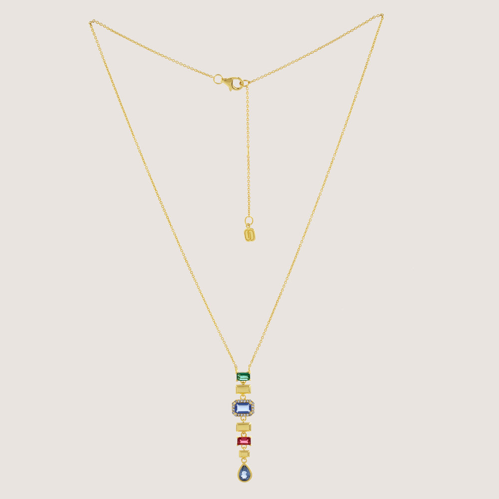 Shop the KiraKira Statement Necklace, crafted in 92.5% sterling silver with 14kt gold plating. This elegant anti-tarnish necklace features ruby, emerald, and sapphire CZ stones along with faceted metal detailing, creating a bold, vibrant statement piece. Perfect for festive celebrations, parties, or gifting.