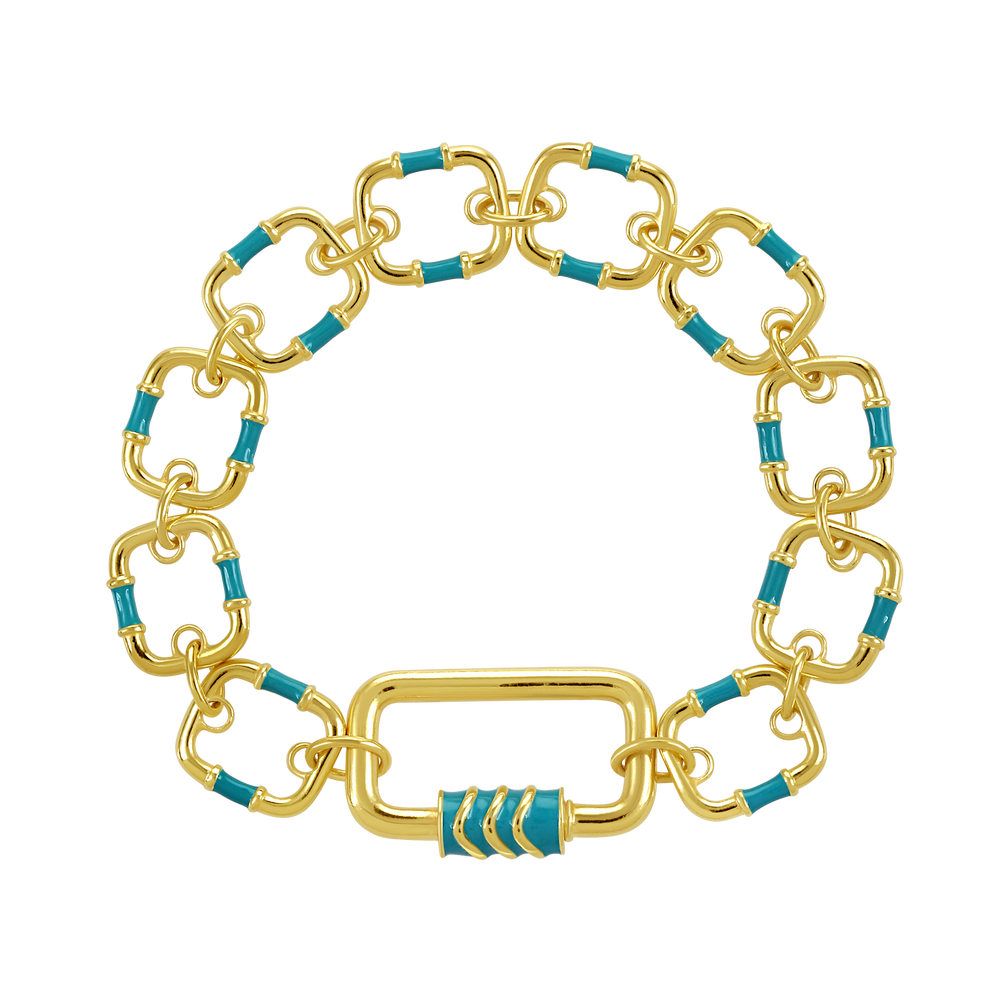 This statement piece is adorned with striking teal enamel accents. Whether stacked or worn solo, this bracelet is sure to uplift your mood. Perfect for pairing with casual, playful outfits or adding a pop of color to your workwear, it is designed to bring joy and style to any occasion. You can also use this bracelet as a necklace component with our Customise Now option.