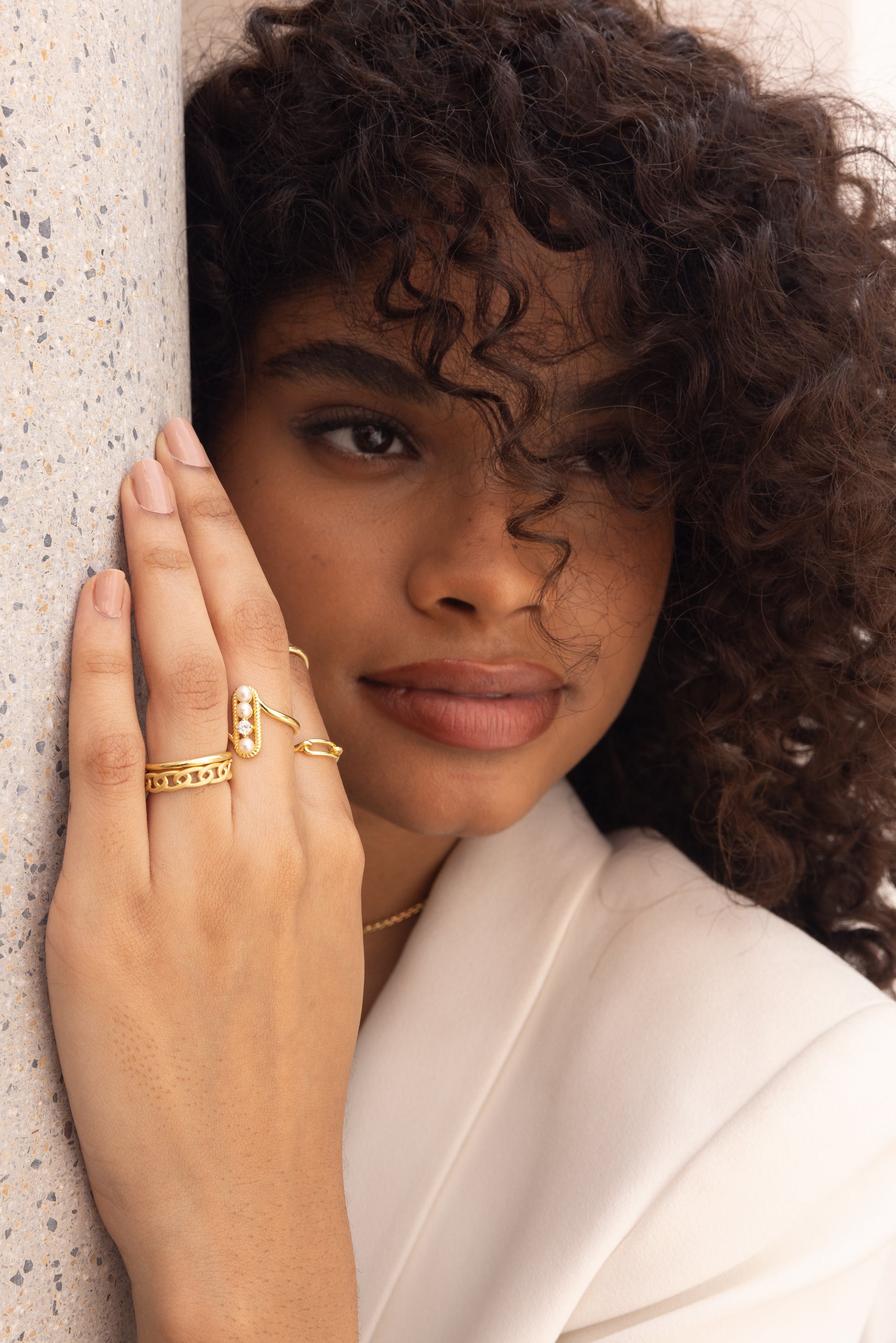 This elongated ring is a modern classic, featuring luminous white shell pearls paired with sparkling CZ stones for an effortlessly elegant finish. Whether styled solo or stacked for a more personalized look, it brings a refined edge to any outfit. A versatile piece that moves seamlessly from day to night.