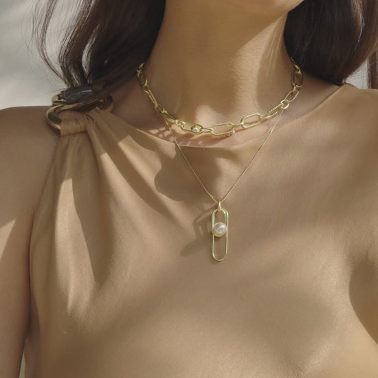 A timeless twist on contemporary style. This double link necklace from our pearl collection offers a graceful balance of elegance and modern charm. Featuring a lustrous white shell pearl and a lightweight design, it’s the perfect piece to transition seamlessly from day to night. Style it solo for understated chic or layer it up for a more elevated look—versatility has never looked so refined.