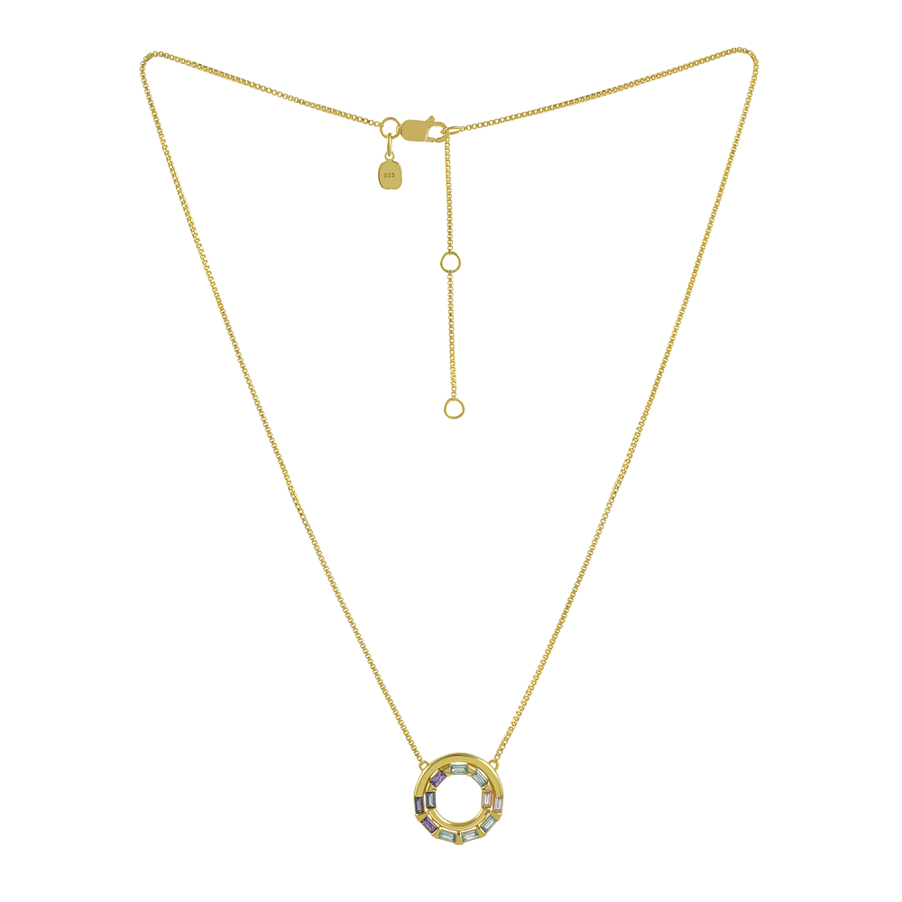 A celebration of color and light, this necklace features a captivating ombre of baguette-cut gemstones, set in radiant gold. Their playful gradient and geometric precision bring a modern, joyful charm to any look. Whether you’re adding a touch of vibrance to everyday outfits or elevating your evening style, the Natsumi Ombre necklace is the perfect accessory for those who love bold elegance with a colorful twist.
