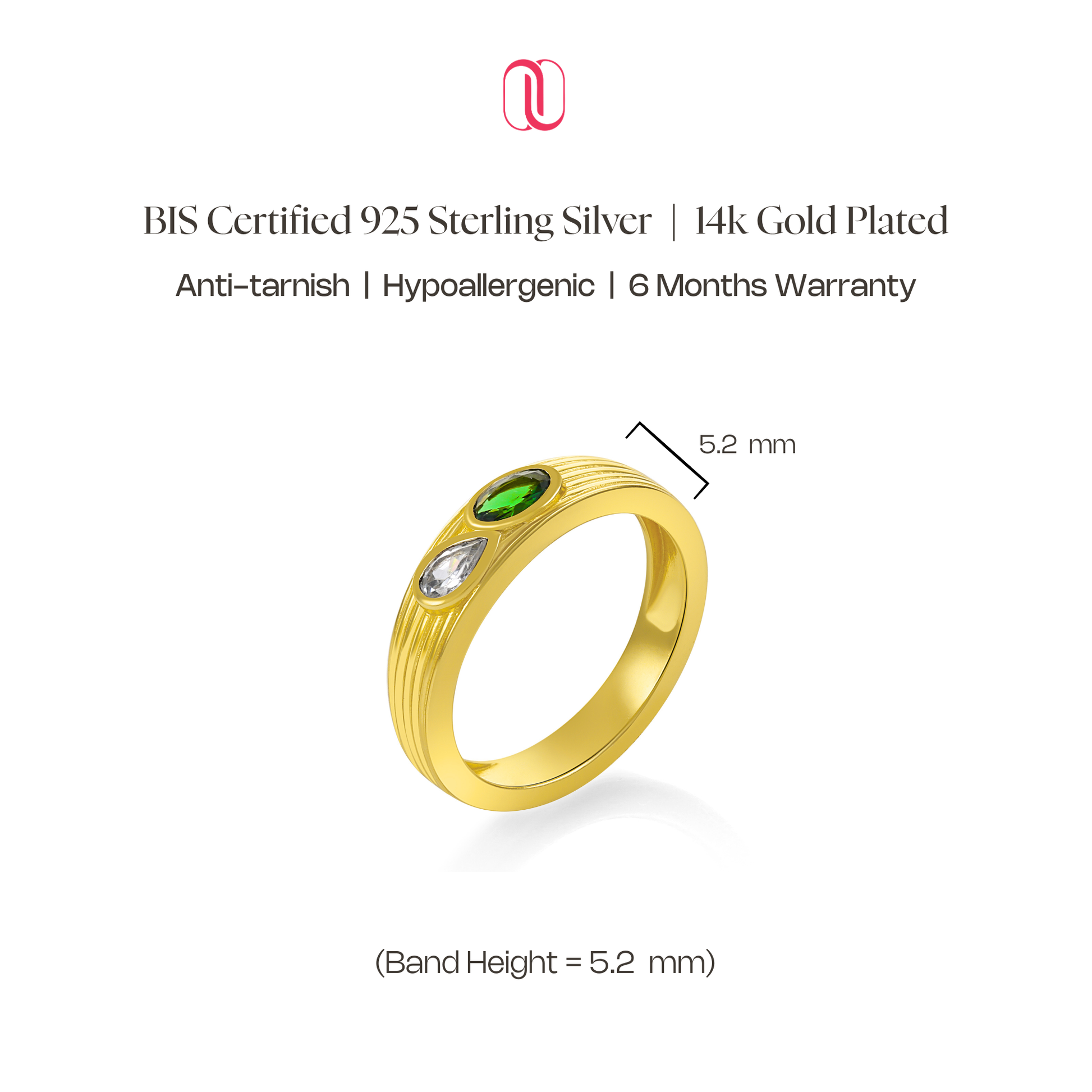 The Natsumi Emerald Ring embodies timeless beauty with a modern twist. Crafted in 925 sterling silver with gold plating and an anti-tarnish finish, this ring features a striking emerald-green stone that adds vibrancy and sophistication to any look.