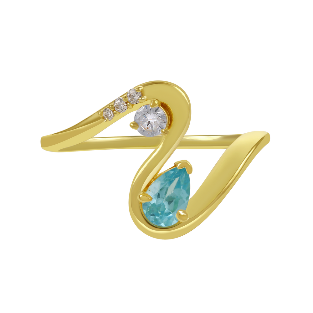 A graceful, fluid gold ring featuring a delicate teardrop gemstone paired with a sparkling round stone, set in a wave-like curve. Its organic silhouette symbolizes movement and elegance, making it a timeless statement piece.